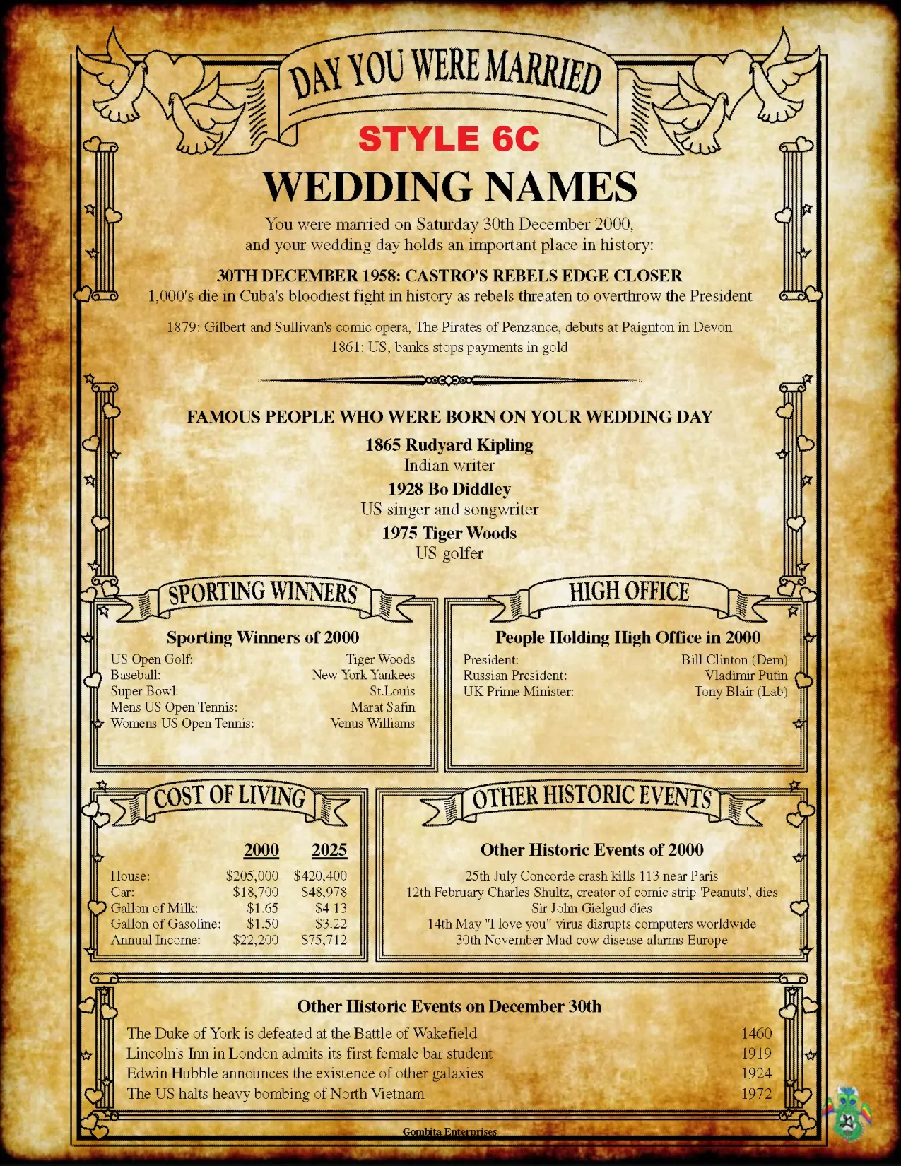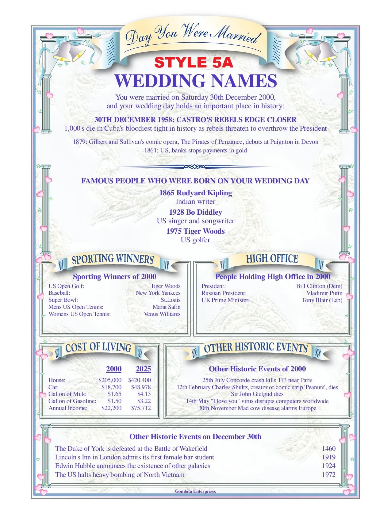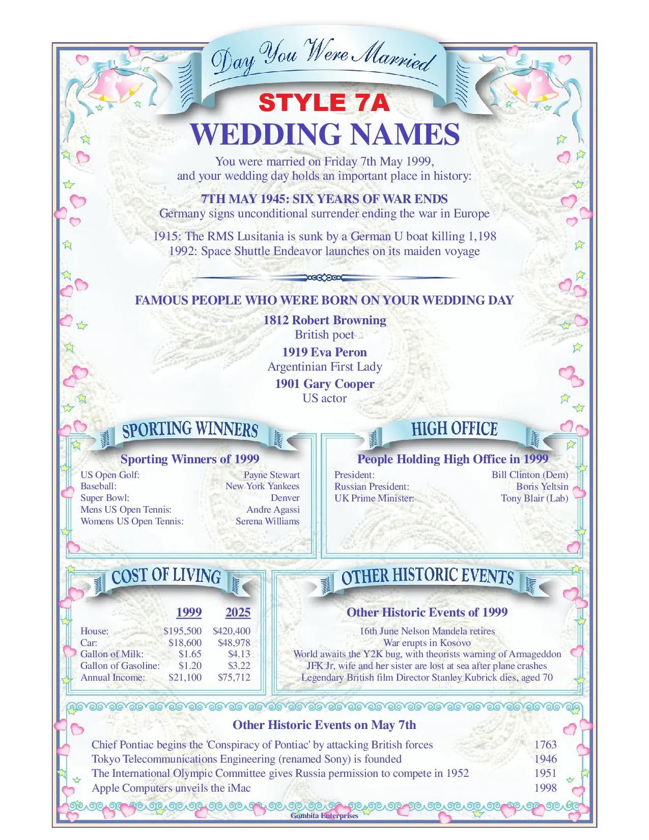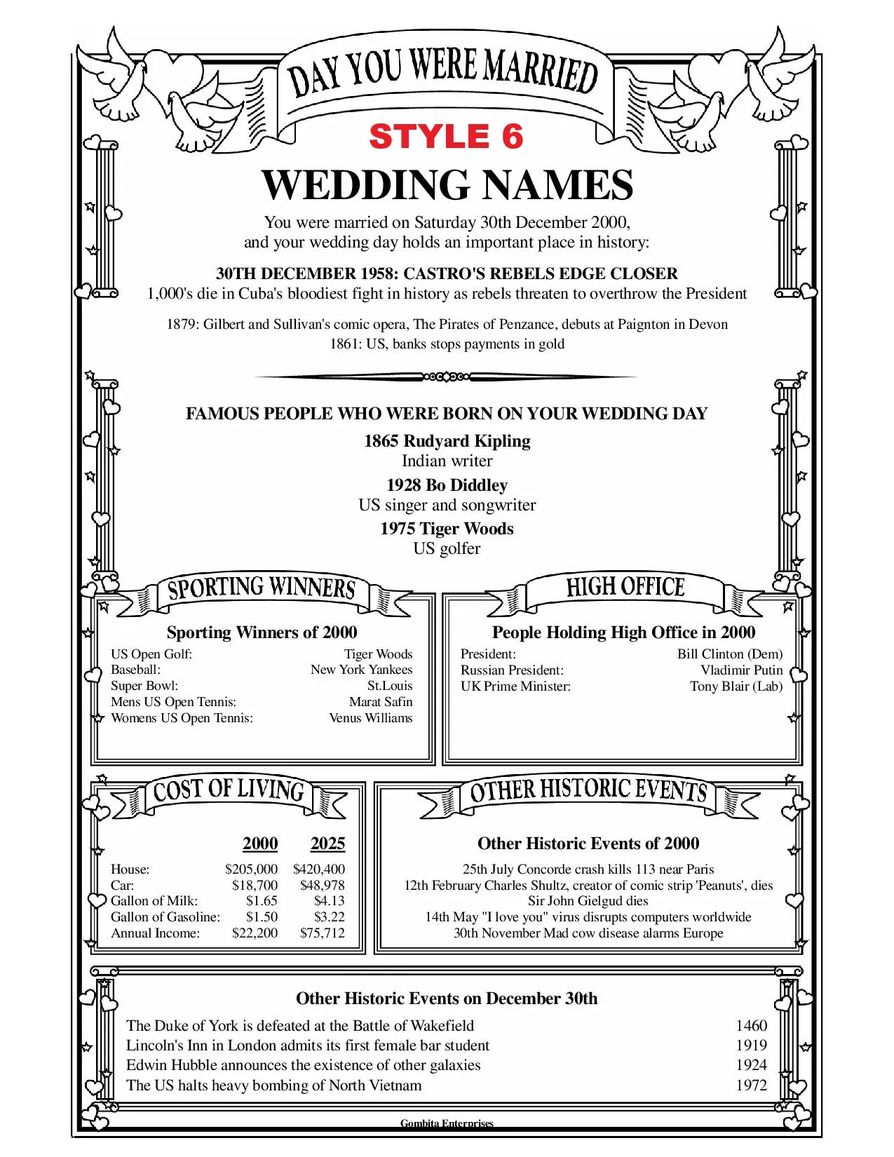 This is a great inexpensive Personalized Keepsake Wedding gift, showing Stores, Nostalgia and Past History from the date you were Married!