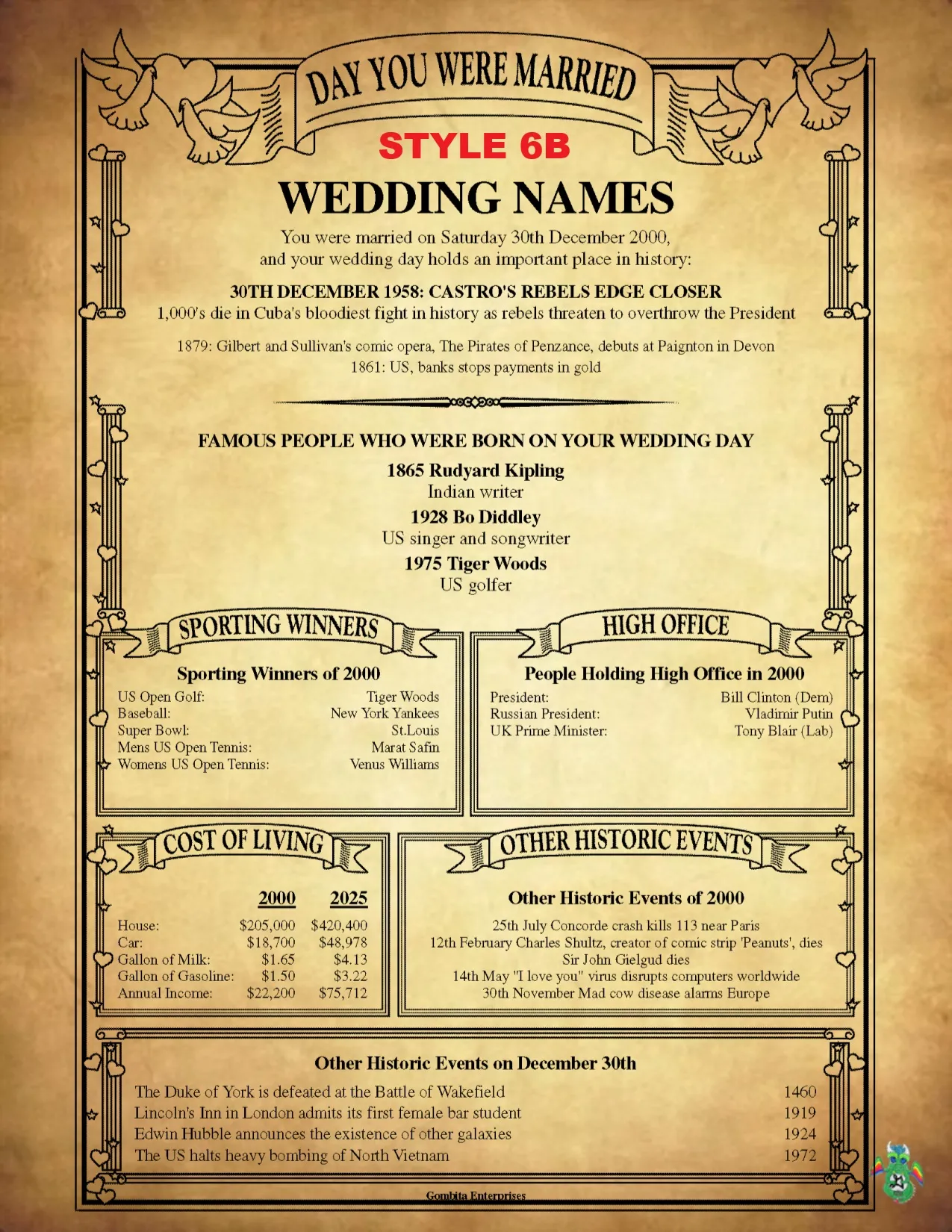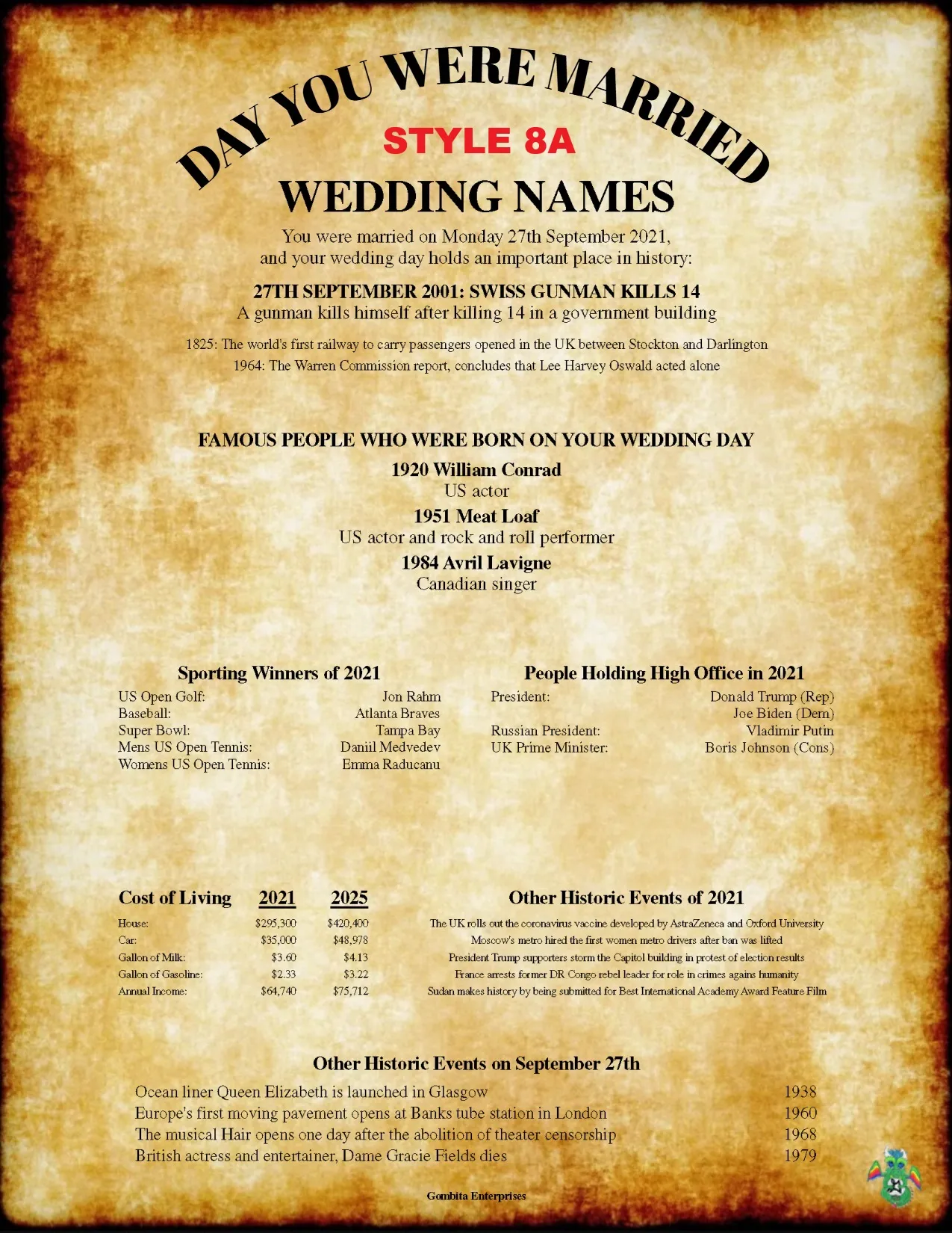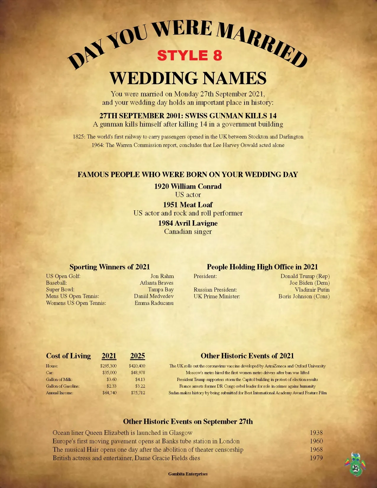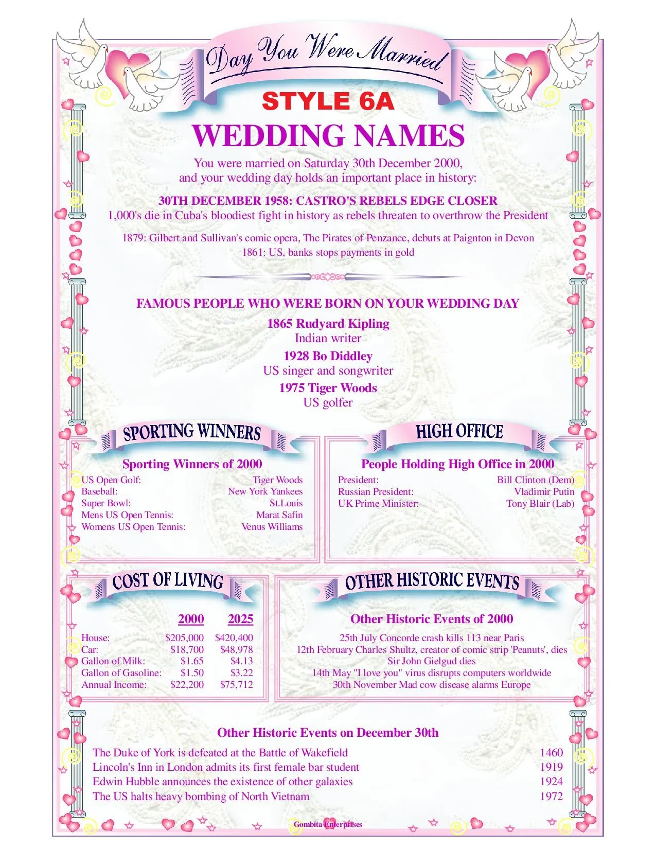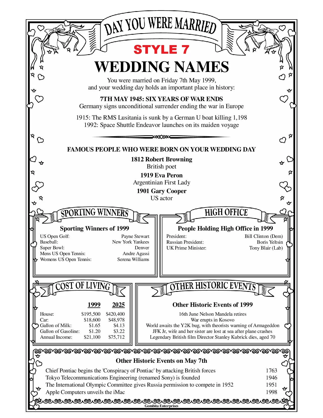 This is a great inexpensive Personalized Keepsake Wedding gift, showing Stores, Nostalgia and Past History from the date you were Married!