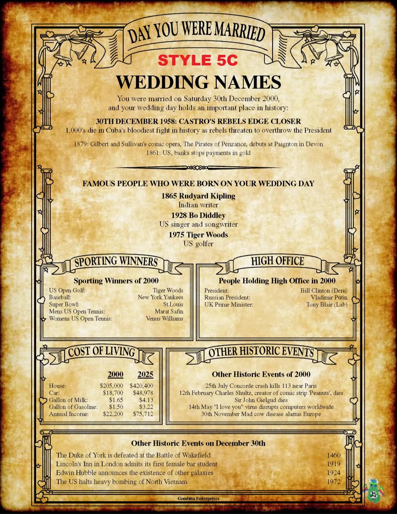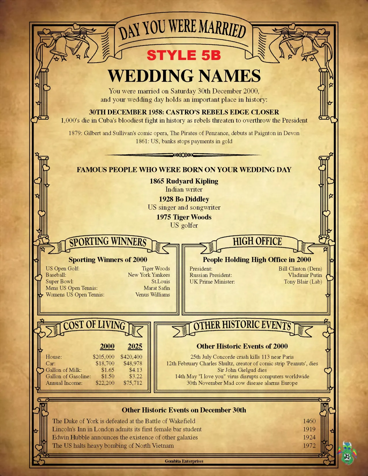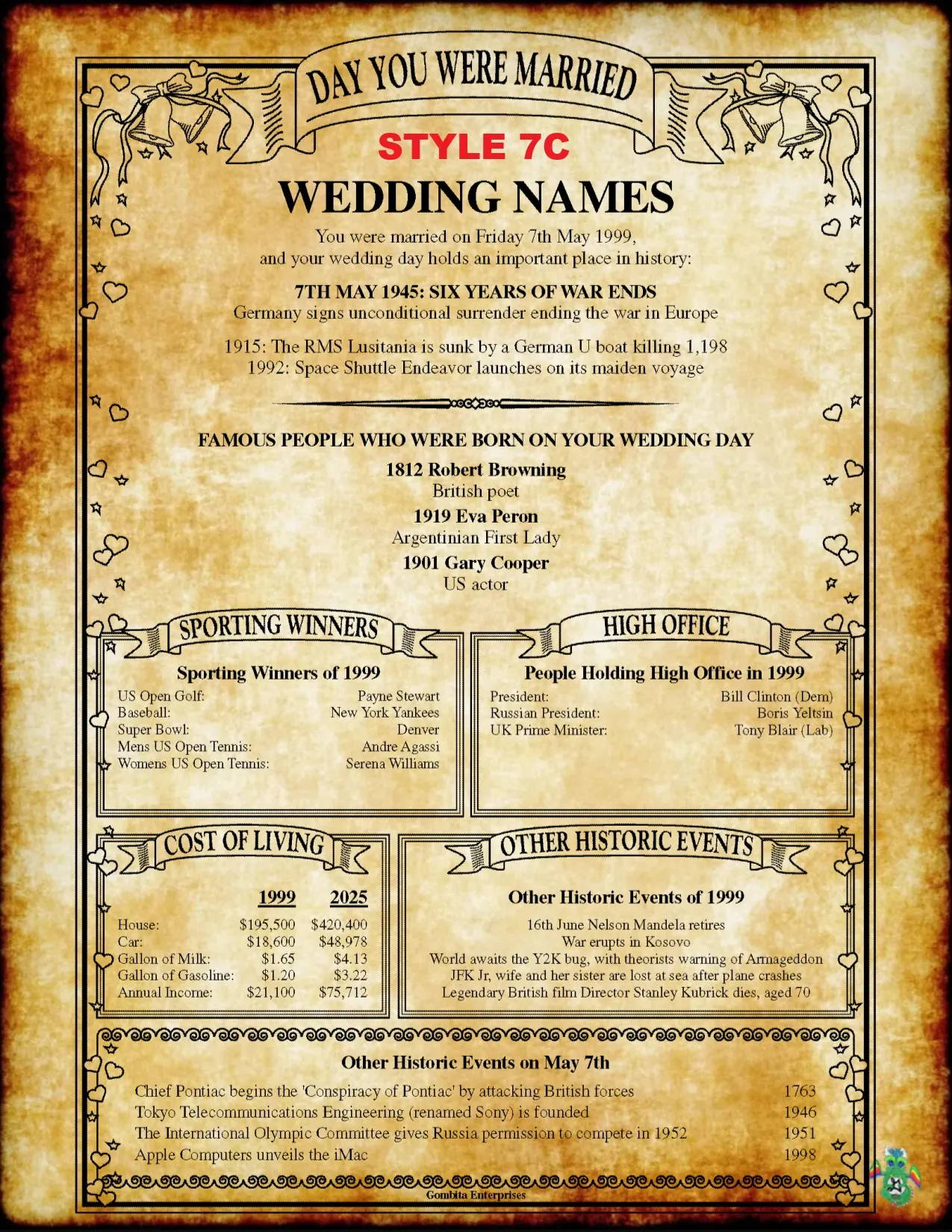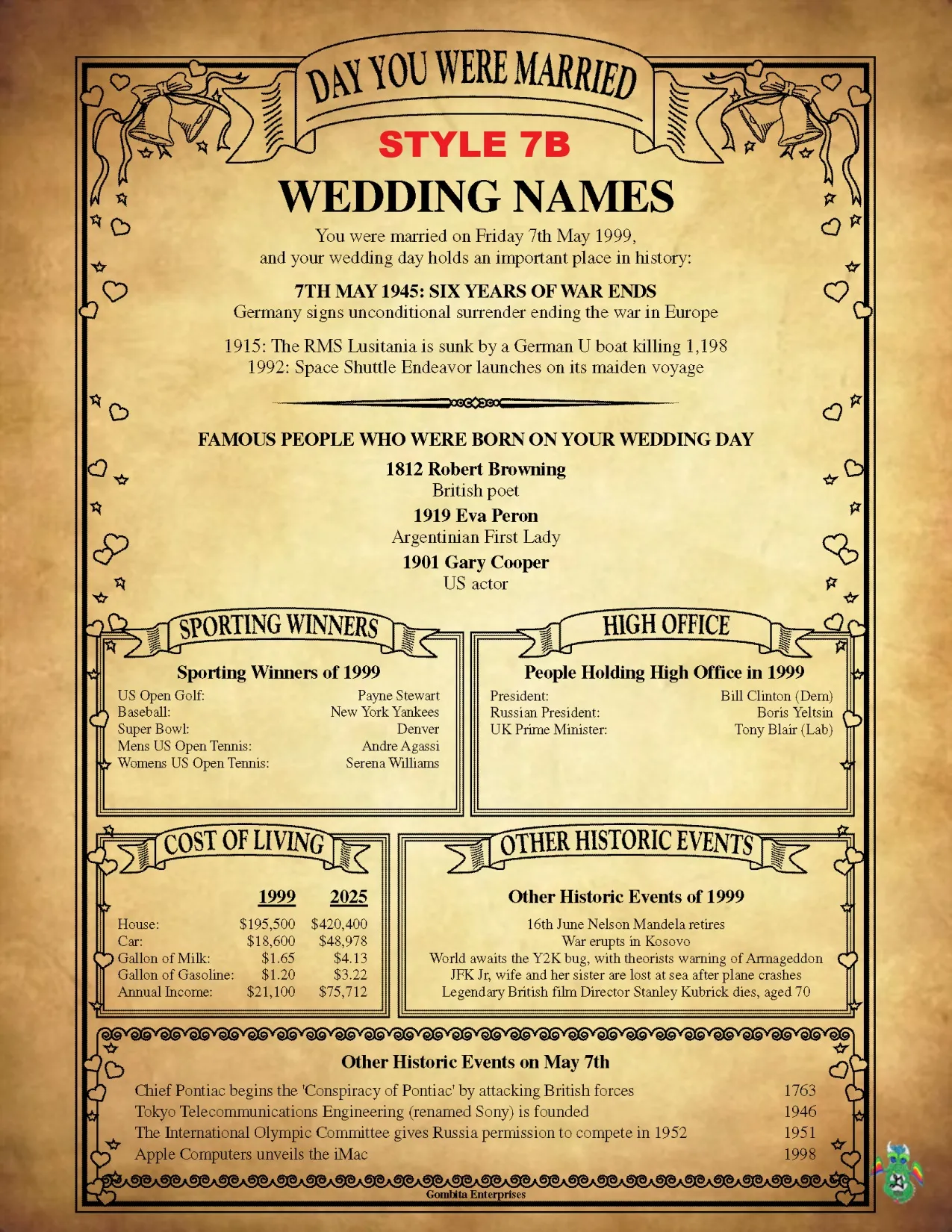 This is a great inexpensive Personalized Keepsake Wedding gift, showing Stores, Nostalgia and Past History from the date you were Married!